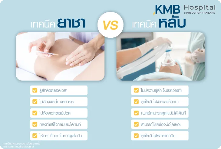 - เทคนิคยาชา เหมาะสำหรับผู้ที่ต้องการรู้สึกตัวตลอดระหว่างการดูดไขมันและยังสามารถพูดคุยกับแพทย์ได้ตลอดขั้นตอน โดยใช้เทคนิค Pure Tumescent ซึ่งช่วยลดความเจ็บปวดได้ดี