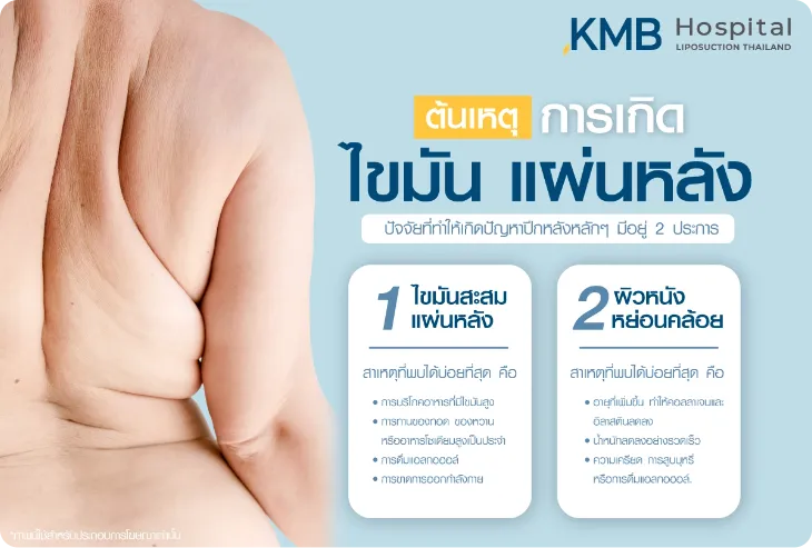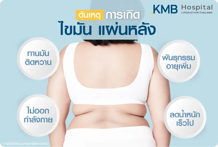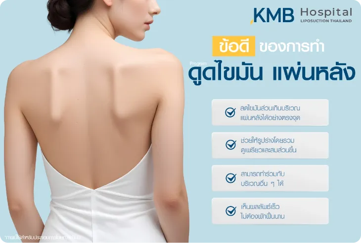 คือการลดไขมันส่วนเกินเฉพาะจุดบริเวณแผ่นหลังส่วนบนและส่วนล่าง ซึ่งเป็นบริเวณที่ไขมันมักสะสมได้ง่าย โดยเฉพาะในผู้ที่มีน้ำหนักตัวเพิ่มขึ้น อายุเพิ่ม หรือมีพฤติกรรมนั่งทำงานนาน ๆ จนทำให้เนื้อบริเวณหลังปลิ้นออกมาชัดเจนเมื่อใส่เสื้อชั้นในหรือเสื้อรัดรูป ไขมันบริเวณนี้มักเป็นไขมันที่ดื้อและลดได้ยากด้วยวิธีออกกำลังกายหรือควบคุมอาหารเพียงอย่างเดียว การทำโปรแกรมดูดไขมันจึงเป็นอีกหนึ่งทางเลือกที่ช่วยปรับสัดส่วนให้ดูเรียบเนียนและได้รูปมากยิ่งขึ้น ที่ KMB Hospital โดยหมอลูกหนู พร้อมทีมแพทย์ผู้ชำนาญการเฉพาะทางด้าน Body Design ให้ความสำคัญกับทุกขั้นตอน ทั้งเรื่องความปลอดภัย ความเรียบเนียนของผิวหลังดูด และผลลัพธ์ที่ดูเป็นธรรมชาติ
